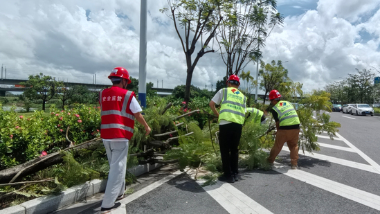 臺風威力減弱后,中國水電五局項目部立即啟動應急預案,不等不靠,將參與地方搶險救災作為首要任務。項目部迅速組建了一支由黨員干部帶頭、精干施工人員和清掃工器具操作手組成的“搶險突擊隊”,調集運輸車等專業設備,奔赴大良街道受災嚴重的重點路段。