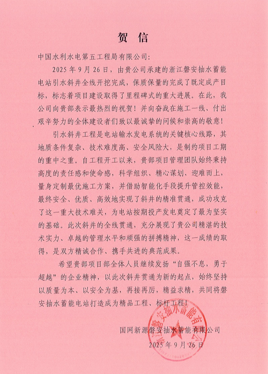 國網新源磐安抽水蓄能有限公司賀信