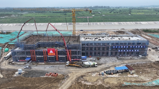 9月20日上午,隨著副廠房最后一方混凝土澆筑順利完工,標志著引江濟淮二期工程合肥水源項目小廟提水泵站主副廠房全面封頂,工程建設全面轉入機電設備安裝新階段。合肥水源工程屬于國家150項重大水利工程之一,于2023年10月16日正式開工。水電五局承建其出口涵閘、箱涵、泵站機電安裝、管理房及泵站上部土建結構及裝修等施工。建成后將在合肥境內實現引江濟淮與淠史杭灌區兩大工程的歷史性牽手,形成“江水、淮水、淠水、湖水”互通互濟的水資源優化配置格局。