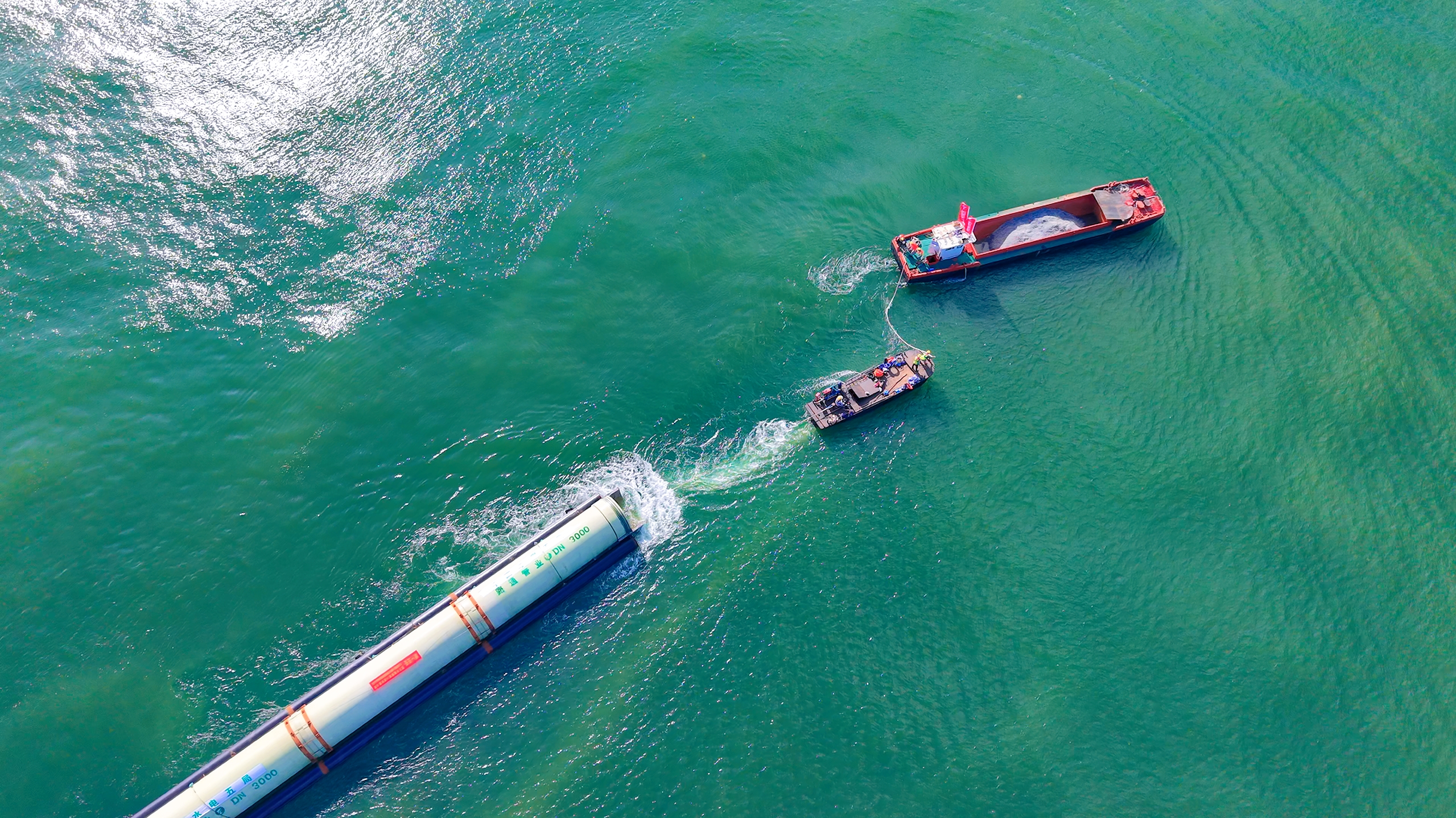 為解決“水下接頭多、浮運難度大”的問題,項目經過多方調研和細致研究,創新提出了“陸上拼接,海上伺機而動”的十字方針。他們將12米一節的管道,通過“管道接頭加固+整體拼裝”的措施,在陸地連接成5節60米的“超長單元”,并采用專用鋼制抱箍加固接頭,提升套筒接口的整體性與抗拉性能,等待風平浪靜的最佳時機將這“鋼鐵巨龍”拖入海里。對于浮運難題,項目引入“助浮鋼管+雙船牽引+實時姿態監測”技術,在保障長段管道海上移動穩定性的同時,確保管段精準沉放。這套方案不僅縮短了水下作業時長,更降低了施工對海洋環境的臨時干擾。
