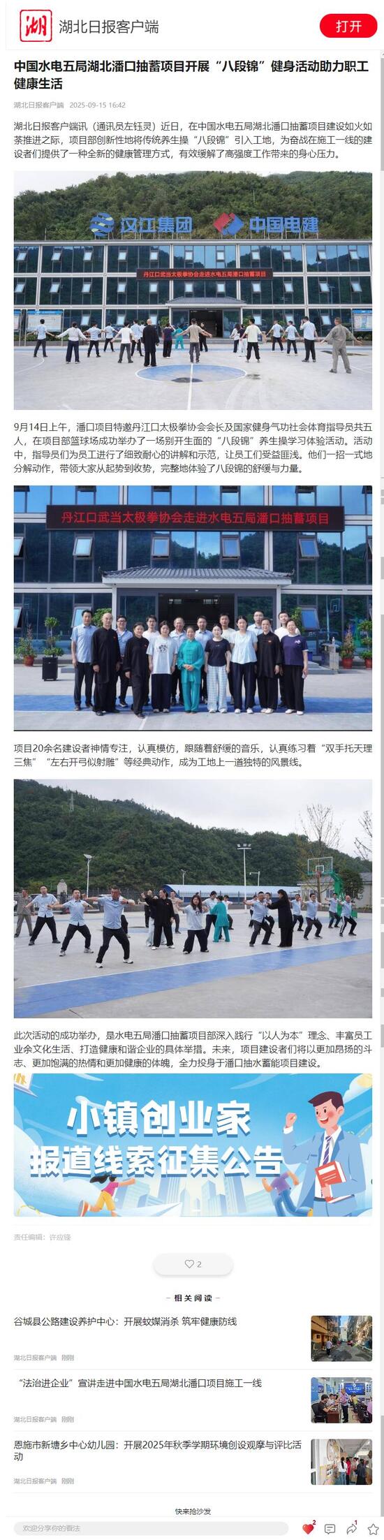 湖北日報客戶端訊(通訊員左鈺靈)近日,在中國水電五局湖北潘口抽蓄項目建設如火如荼推進之際,項目部創新性地將傳統養生操“八段錦”引入工地,為奮戰在施工一線的建設者們提供了一種全新的健康管理方式,有效緩解了高強度工作帶來的身心壓力。