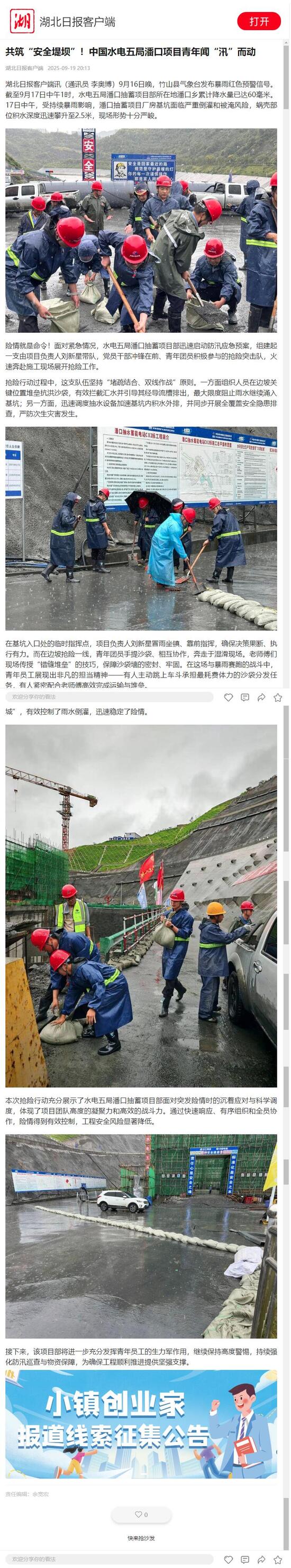 險情就是命令!面對緊急情況,水電五局潘口抽蓄項目部迅速啟動防汛應急預案,組建起一支由項目負責人劉新星帶隊,黨員干部沖鋒在前、青年團員積極參與的搶險突擊隊,火速奔赴施工現場展開搶險工作。