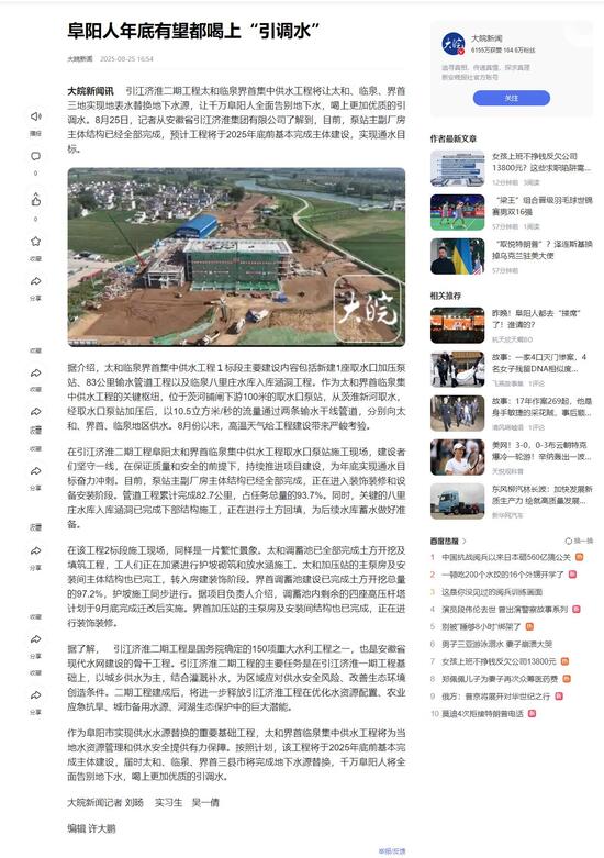 大皖新聞?dòng)? 引江濟(jì)淮二期工程太和臨泉界首集中供水工程將讓太和、臨泉、界首三地實(shí)現(xiàn)地表水替換地下水源,讓千萬(wàn)阜陽(yáng)人全面告別地下水,喝上更加優(yōu)質(zhì)的引調(diào)水。8月25日,記者從安徽省引江濟(jì)淮集團(tuán)有限公司了解到,目前,泵站主副廠房主體結(jié)構(gòu)已經(jīng)全部完成,預(yù)計(jì)工程將于2025年底前基本完成主體建設(shè),實(shí)現(xiàn)通水目標(biāo)。