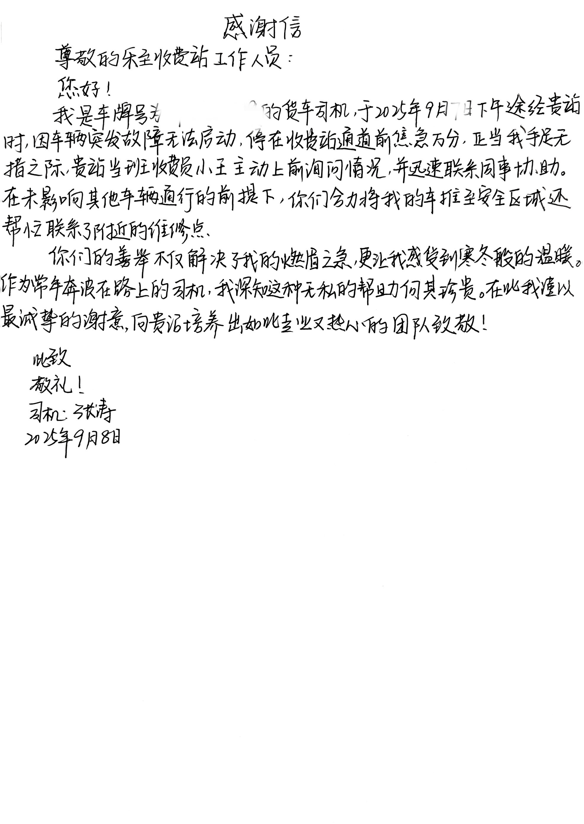 9月13日,中電建渝蓉高速運(yùn)營(yíng)管理部樂至收費(fèi)站工作人員收到一封手寫感謝信。寫信人是9月7日下午途經(jīng)該站的貨車司機(jī)張先生,字里行間滿是對(duì)收費(fèi)站工作人員的真摯感激。