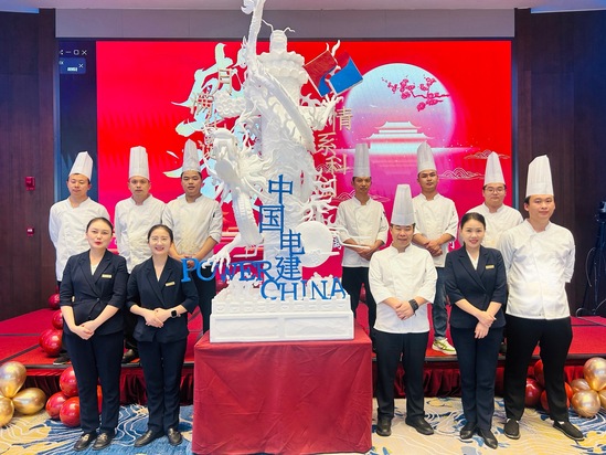 9月31日,五興公司天新蜀域國際酒店項目青年團隊別出心裁,歷經十日匠心打造,以一座手雕華表獻禮佳節。行政總廚肖波率先牽頭構思,迅速點燃團隊創作熱情。餐飲管理團隊隨即展開多輪研討,從華表的整體景觀形態到局部龍紋細節,每一個環節都反復推敲、精益求精。為踐行綠色環保理念,團隊巧妙利用廢舊紙板、環保顏料作為基礎材料,以泡沫為基底,用菜刀、剪刀等日常工具替代專業雕刻器械,在反復試錯與調整中打磨細節,讓“中國電建”字樣與龍紋圖案逐漸清晰立體。
